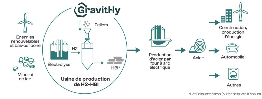 GravitHy met en œuvre un procédé industriel de pointe pour produire du fer pré réduit (DRI) à partir d’hydrogène bas carbone. Ce processus permet de remplacer le charbon utilisé dans les hauts-fourneaux par une solution propre et durable, réduisant jusqu’à 90 % les émissions de CO₂ liées à la production de fer.
